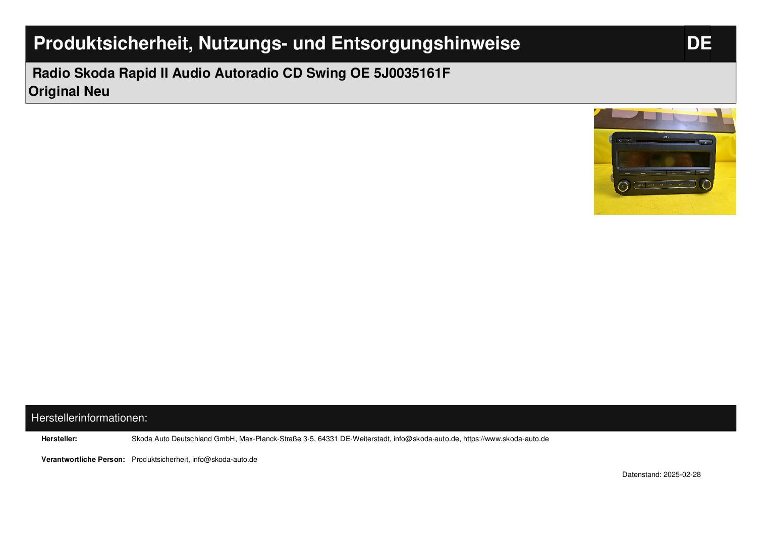 Radio Skoda Rapid II Audio Autoradio CD Swing OE 5J0035161F Original Neu
